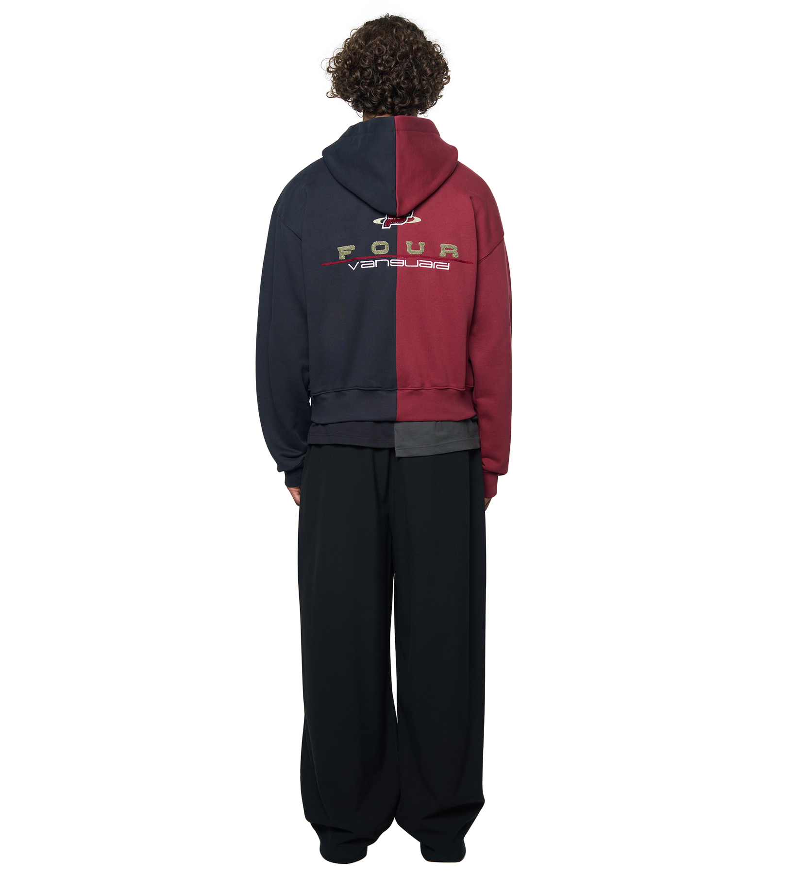 Details include a two-way zipper, a kangaroo pocket, and a mix of embroidery artwork on the front and screenprint artwork on the back. The contrasting black and pomegranate tones emphasize its bold, statement-driven design, blending utility with graphic expression.