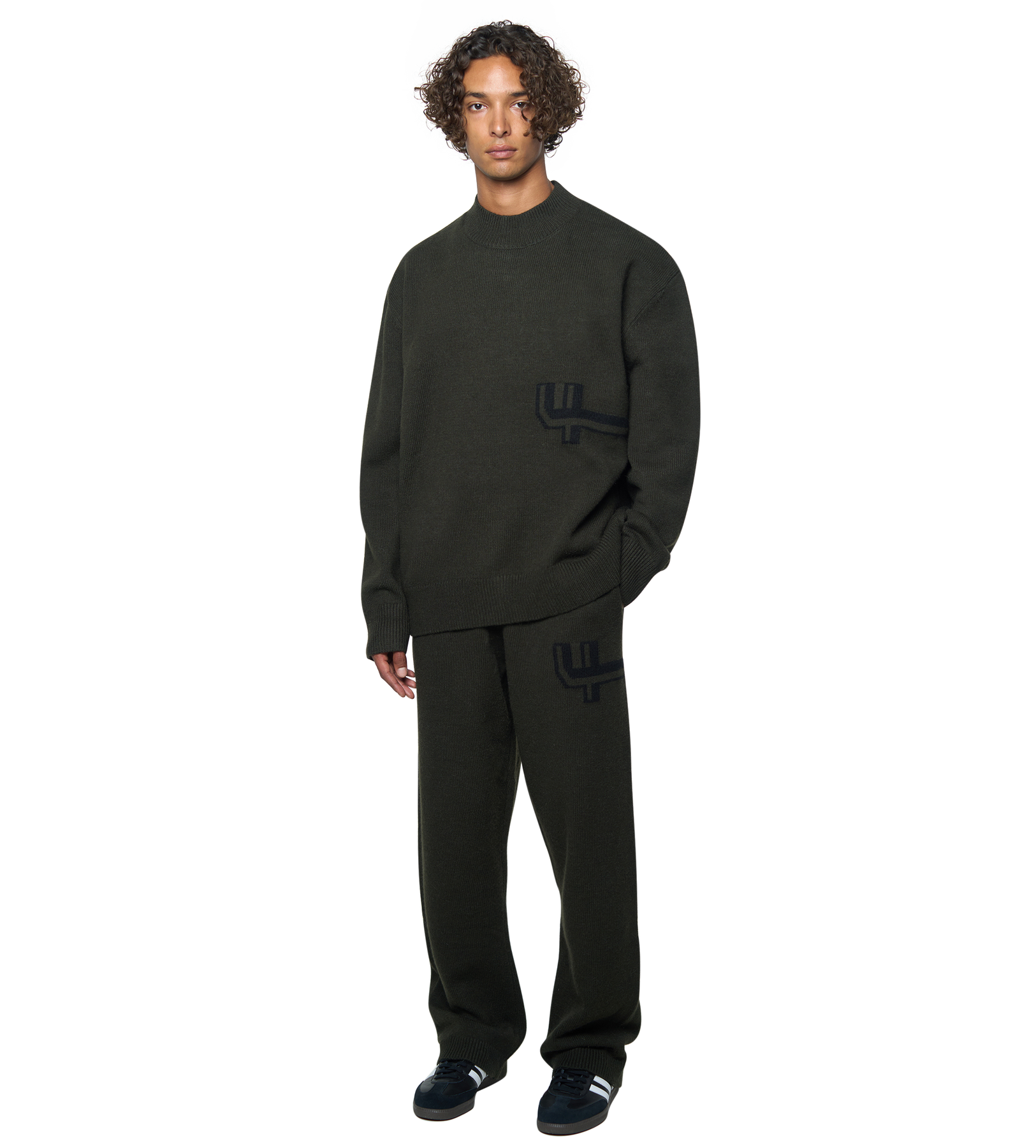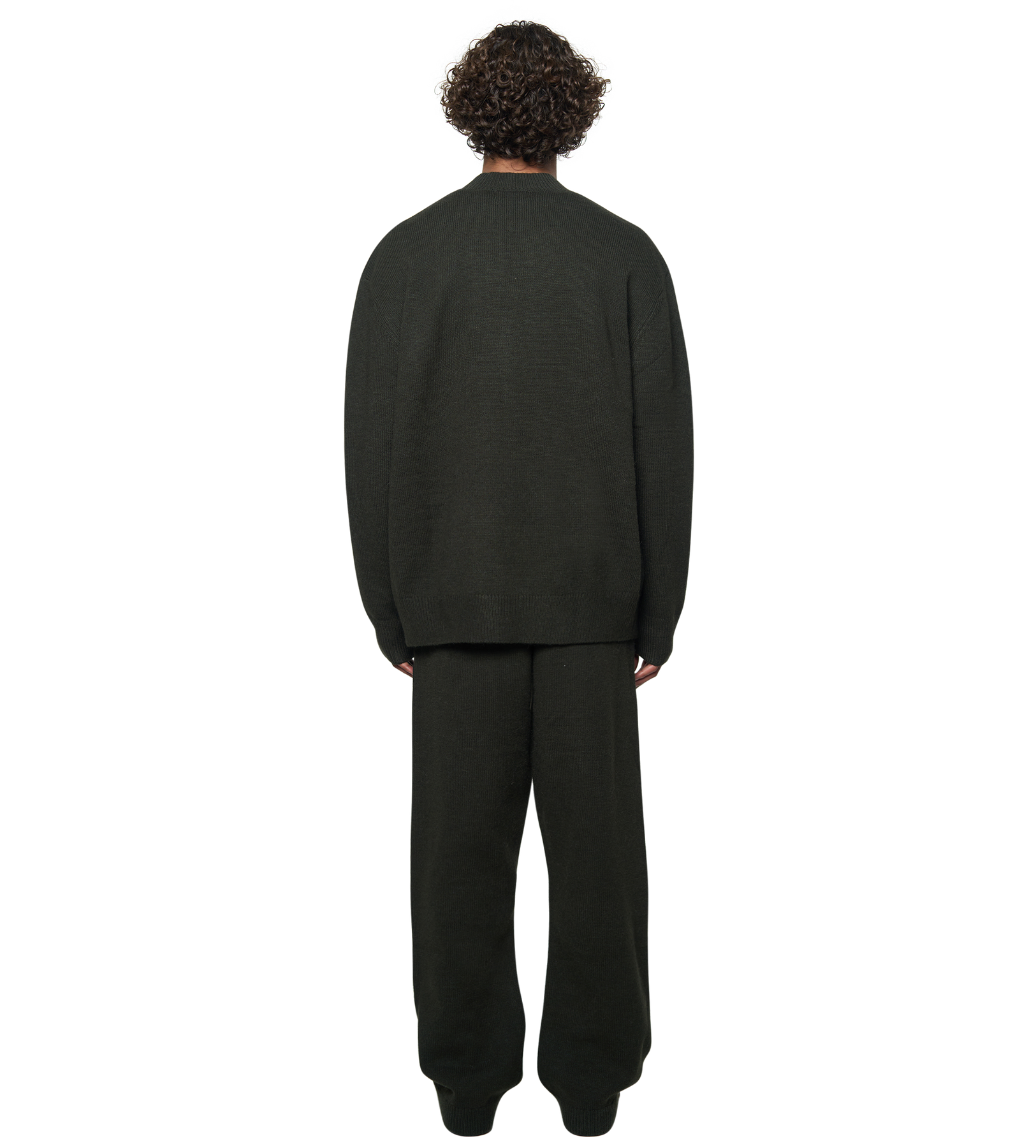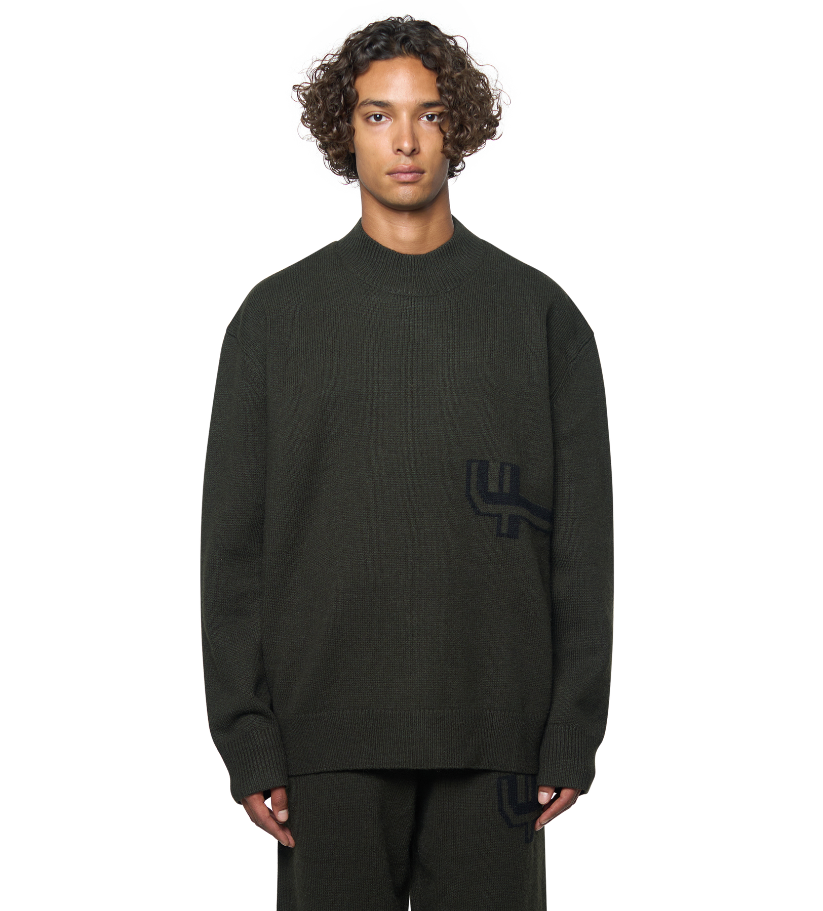 The Knitted Crewneck in dark green and black is a modern wardrobe staple, designed with a regular fit and dropped shoulders for a relaxed silhouette. Crafted from a soft blend of acrylic, wool, polyester, and alpaca, it combines warmth, durability, and a textured hand feel.